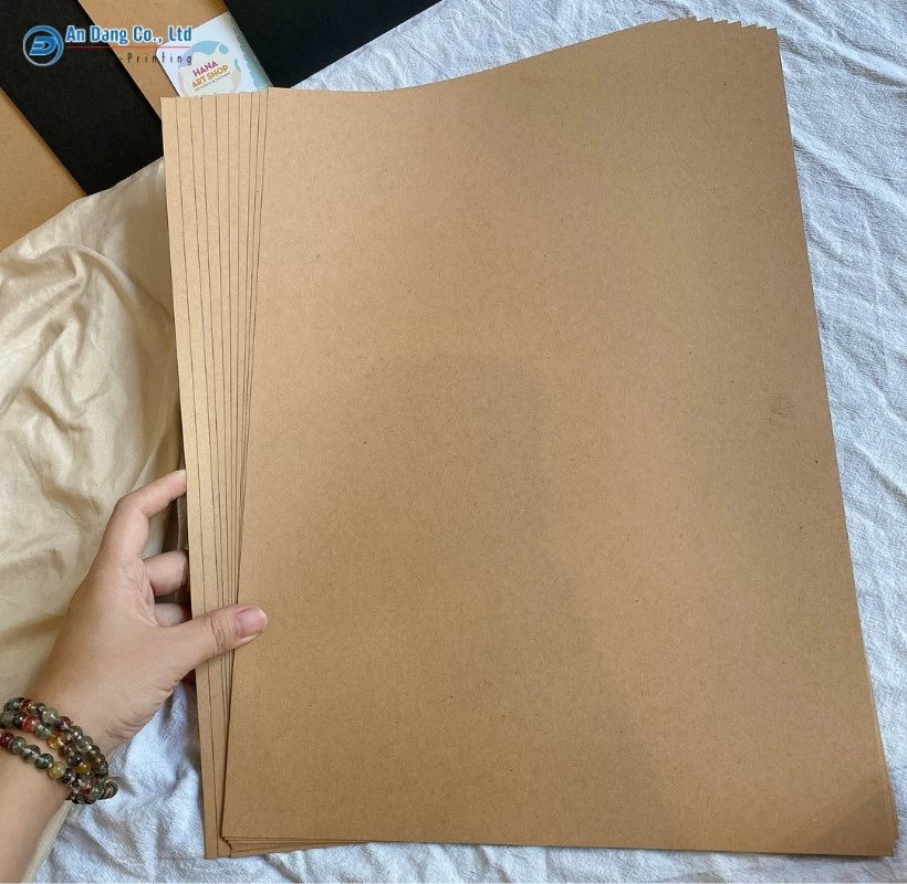 Giấy Kraft có định lượng từ 60 – 300 GSM. Đây là dòng giấy có màu nâu tự nhiên, bề mặt hơi nhám, dẻo dai, mang lại cảm giác mộc mạc và thân thiện với môi trường. Tuy nhiên, giấy Kraft có nhược điểm là không hiển thị màu sắc, hình ảnh bắt mắt, nhất là đối với các tông màu sáng. Ngoài ra, mực in trên giấy Kraft thường bị “trầm” hơn so với màu trong file thiết kế.