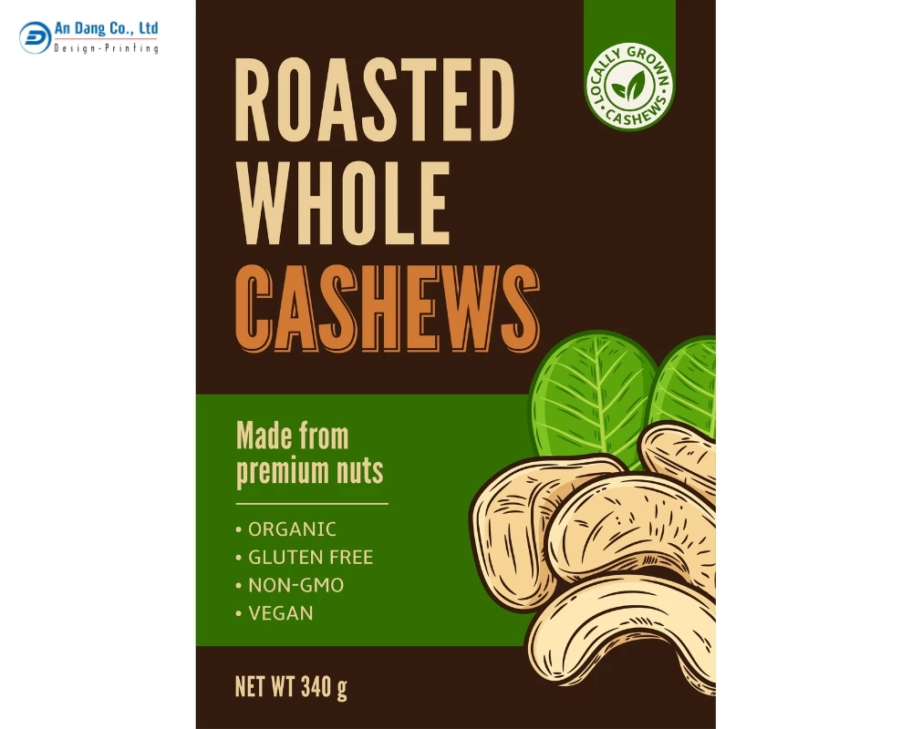 - Xác định kỹ thuật gia công. Tem hạt điều sẽ thêm phần bền đẹp, bắt mắt khi được gia công cán màng, ép kim,…